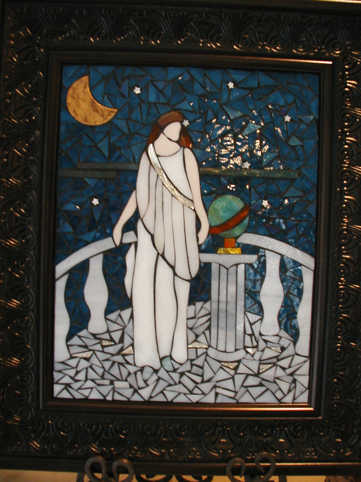 A Mosaic of Ouranie, the greek Muse of Astrology. There will be more Mosaics of different Muses for an Exhibit next year. This one sold at a Benefit Auction. Still one of my favorite pieces.