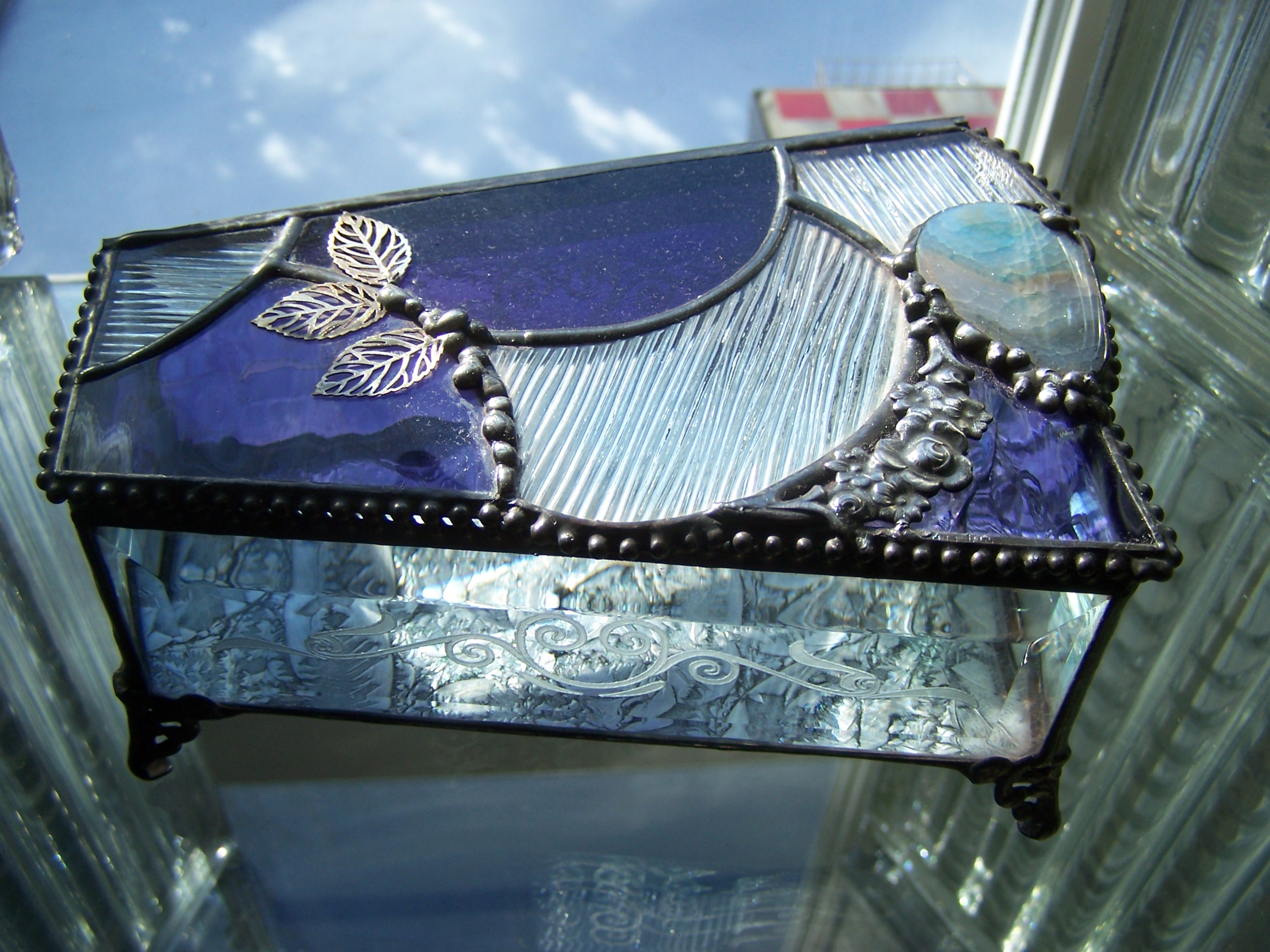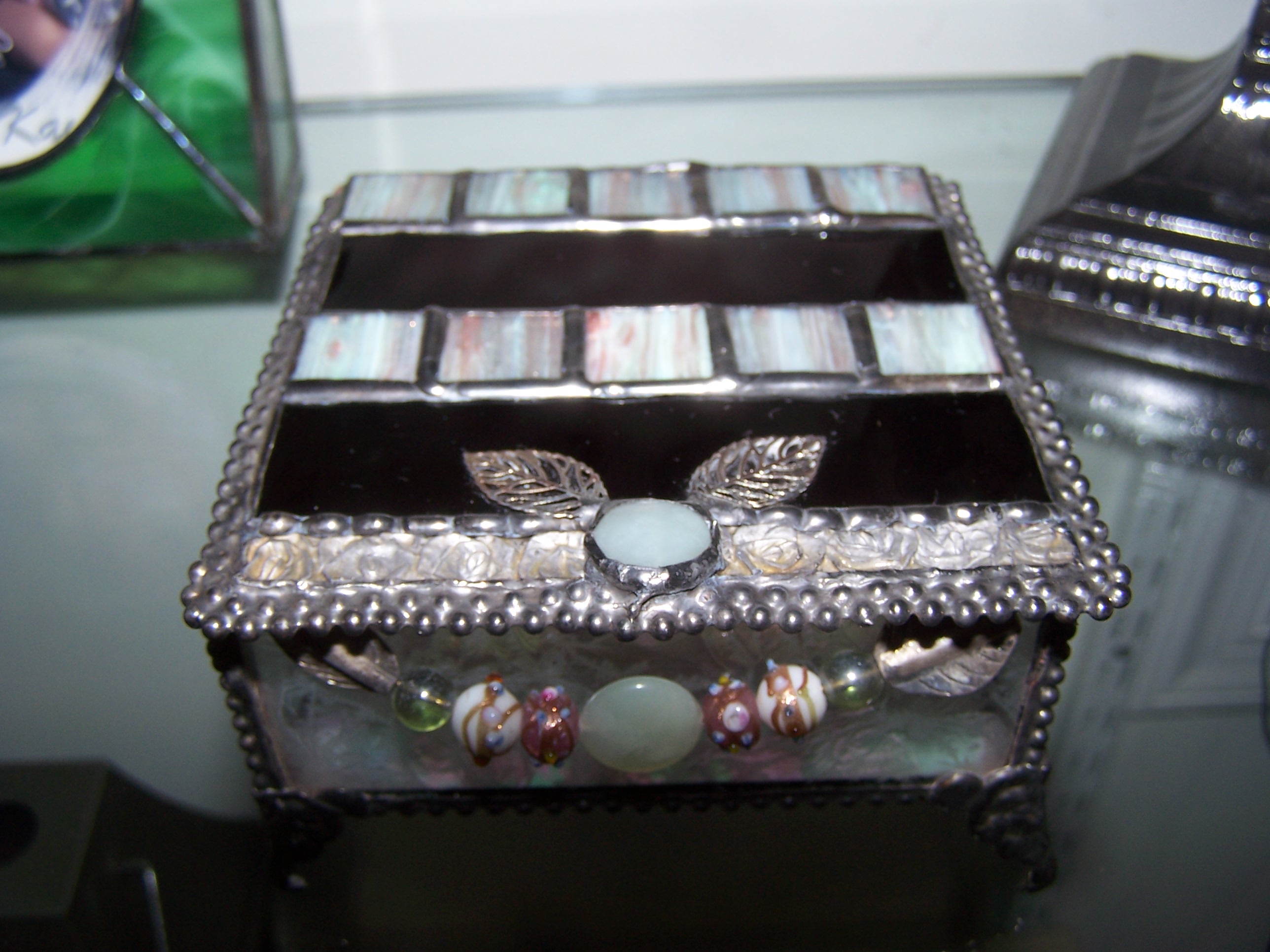 While I am waiting for a large glass shipment to arrive to create the glass Butterflies for the new Hershey Conservatory, I finished some custom orders. There was time to make some Treasure boxes for the Gallery at La Cigale and some upcoming shows. And I was thinking that the little Treasure boxes must surely be one of my favorite projects. Each one so unique, they allow me to pack as much or as little punch as I like into each one. When you look closely at them you can see beads, metal leaves, Geodes and Bevels. They all combine with the carefully chosen Artglass to make each one unique.